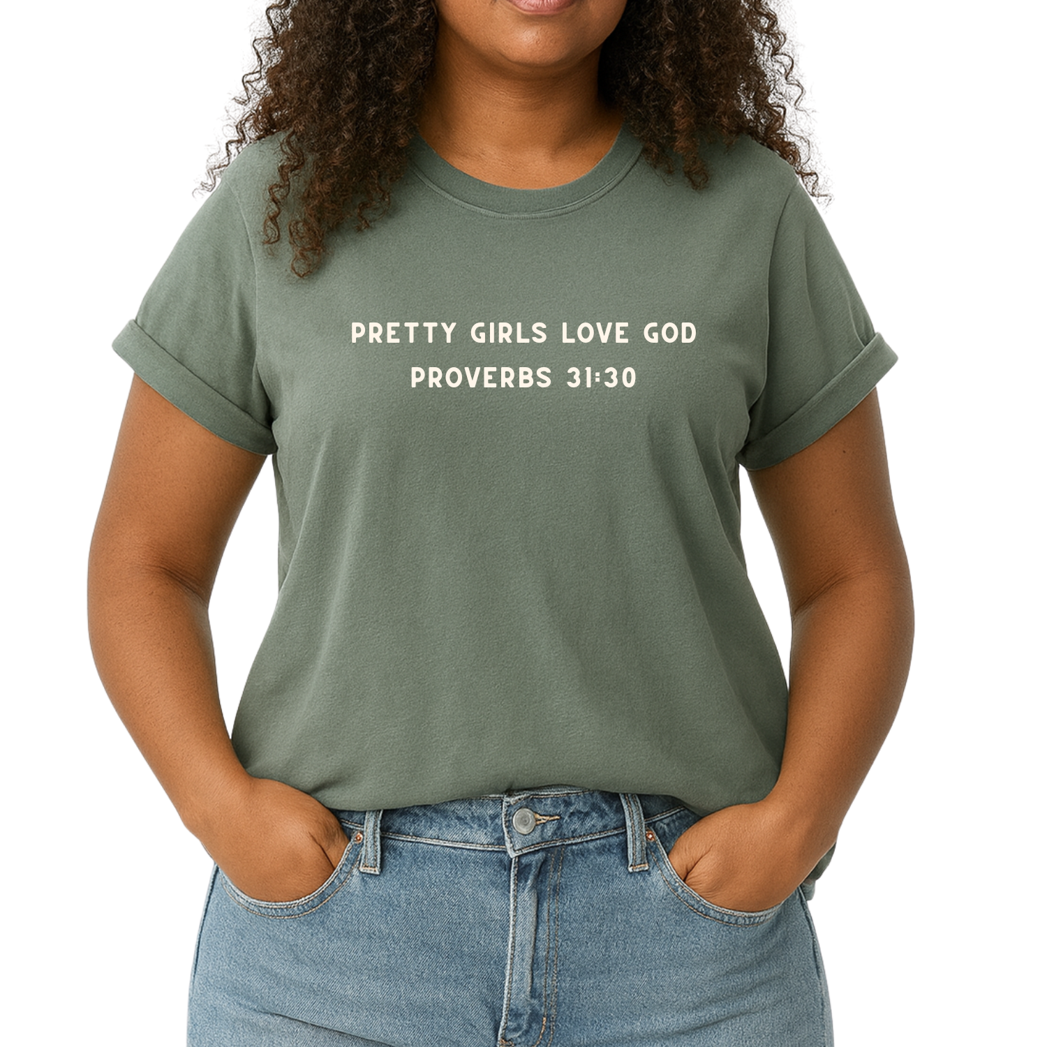 - “Pretty Girls Love God” printed in minimalist lettering